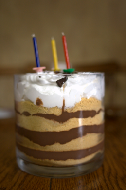 Mas, como as massas continuavam saborosas mesmo com a aparência disforme, para evitar o prejuízo ela passou a colocá-las em um pote transparente, recheando-as em camadas. A princípio, sua criação foi chamada de “bolo de vidro”.